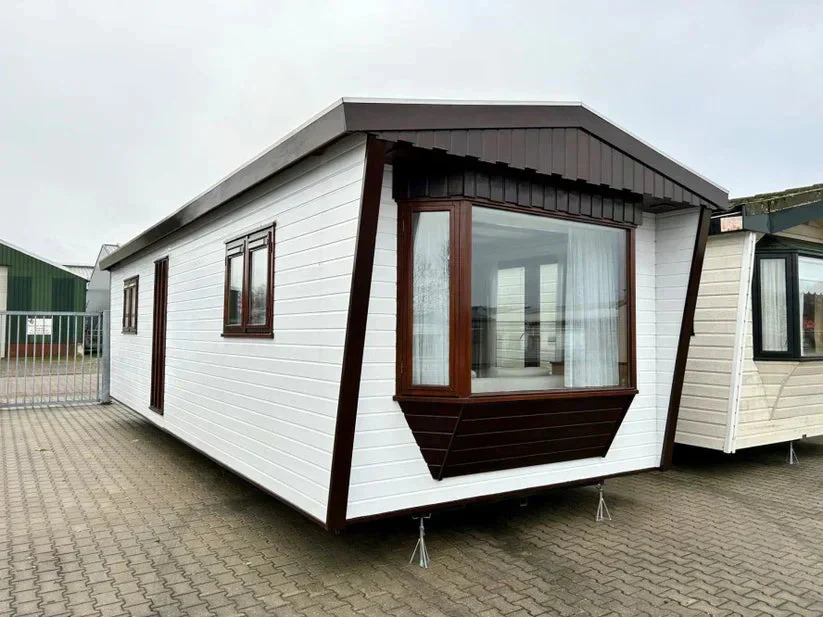 La casa móvil cuenta con unas dimensiones de 8,3 m de largo por 4 m de ancho, equipada con un techo a dos aguas y revestimiento exterior en PVC. Su distribución central organiza los espacios de manera práctica, ofreciendo 2 habitaciones, 1 cuarto de baño, cocina y un salón principal que completan una vivienda funcional y compacta.