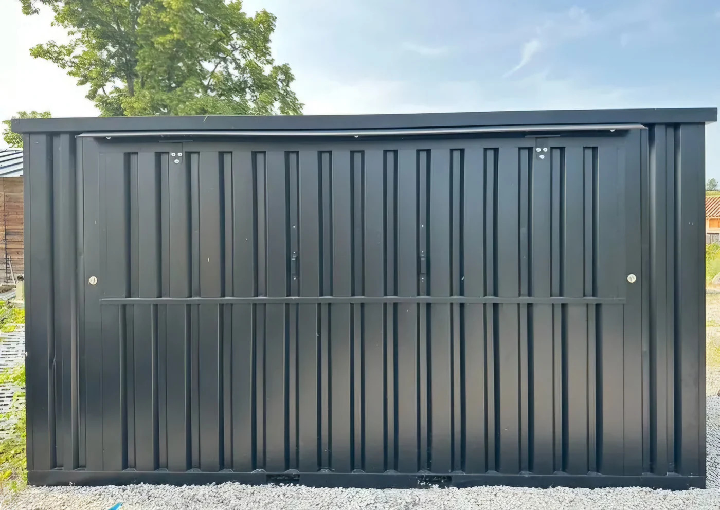 Este contenedor incluye puertas dobles en los lados corto y largo, un techo con perfil de 2,00 mm de grosor y un suelo de madera contrachapada de 28 mm. Además, cuenta con barras de cierre galvanizadas y puede ser manipulado fácilmente mediante grúa o carretilla elevadora.