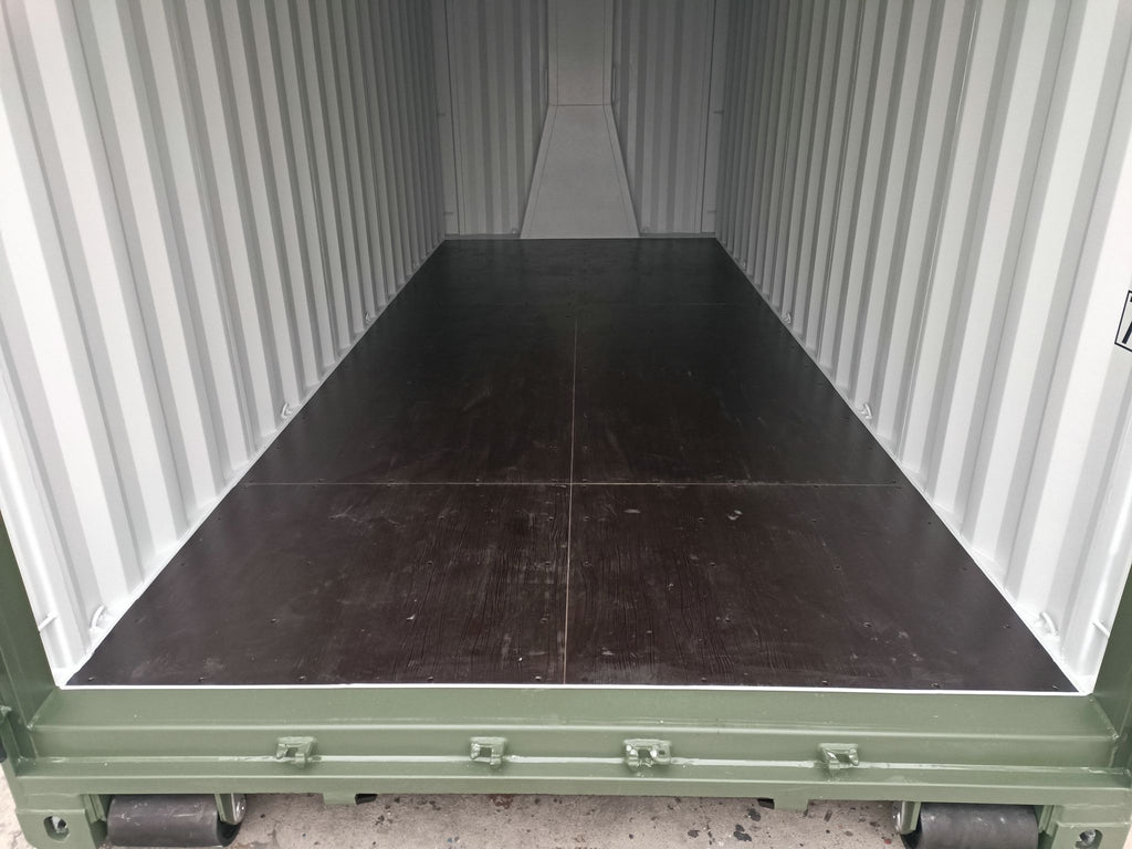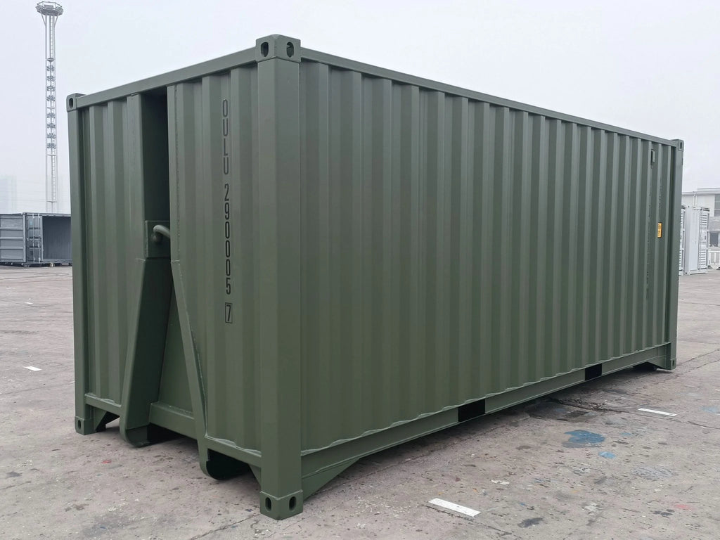 Contenedor marítimo estándar de 20 pies con puertas dobles en un extremo y piso personalizable (bambú, contrachapado marino o acero reforzado).