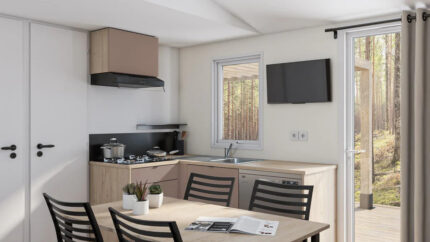 Disfruta de la Trigano Deluxe, una casa móvil diseñada para el confort y la funcionalidad. Su amplio salón y zona de estar se complementan con un banco convertible en cama supletoria. La iluminación LED decorativa, las cortinas opacas y la mesa de madera crean un ambiente acogedor. Además, puertos USB y tomas de TV permiten mantener tus dispositivos conectados en todo momento.